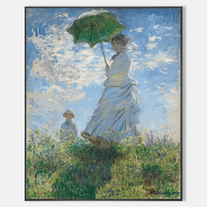 Silhouetted against a dazzling, azure blue sky, Suzanne Hoschedé, soon to become Monet's adoptive daughter, is revealed as The Woman with a Parasol in this painting of 1886. With dazzling precision and the greatest informality, the artist captured this impressionistic reproduction of an epiphanic moment, forging a vast mosaic of swirling fabric and rushing wind, suggesting the infinite and intangible force of light and air.(replica)